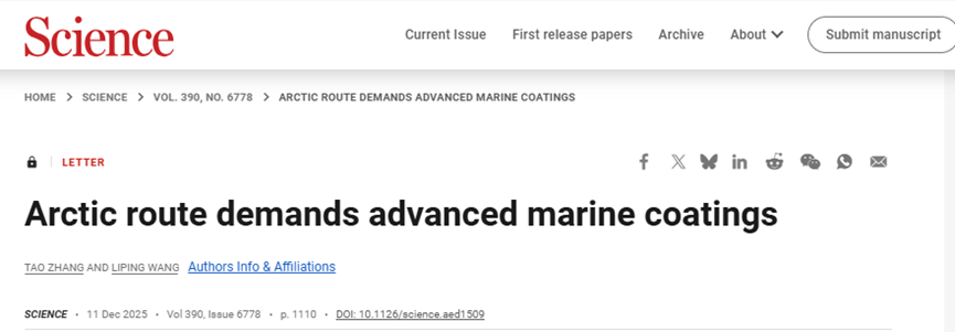 海洋实验室在Science发表关于北极航线先进海洋涂层Letter文章