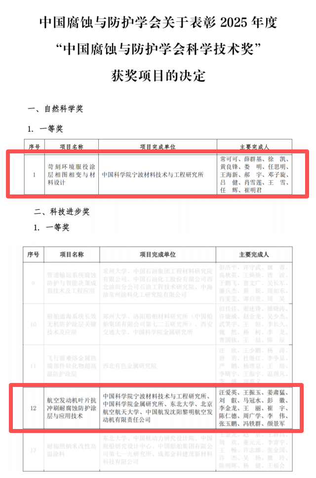 近日,中国腐蚀与防护学会正式公布2025年度“中国腐蚀与防护学会科学技术奖”获奖项目。海洋关键材料全国重点实验室在本次评选中表现突出,一举摘得两项一等奖,展现了实验室在腐蚀科学与防护技术领域深厚的研发实力与持续的创新活力。两项一等奖均由中国科学院宁波材料技术与工程研究所作为第一完成单位。